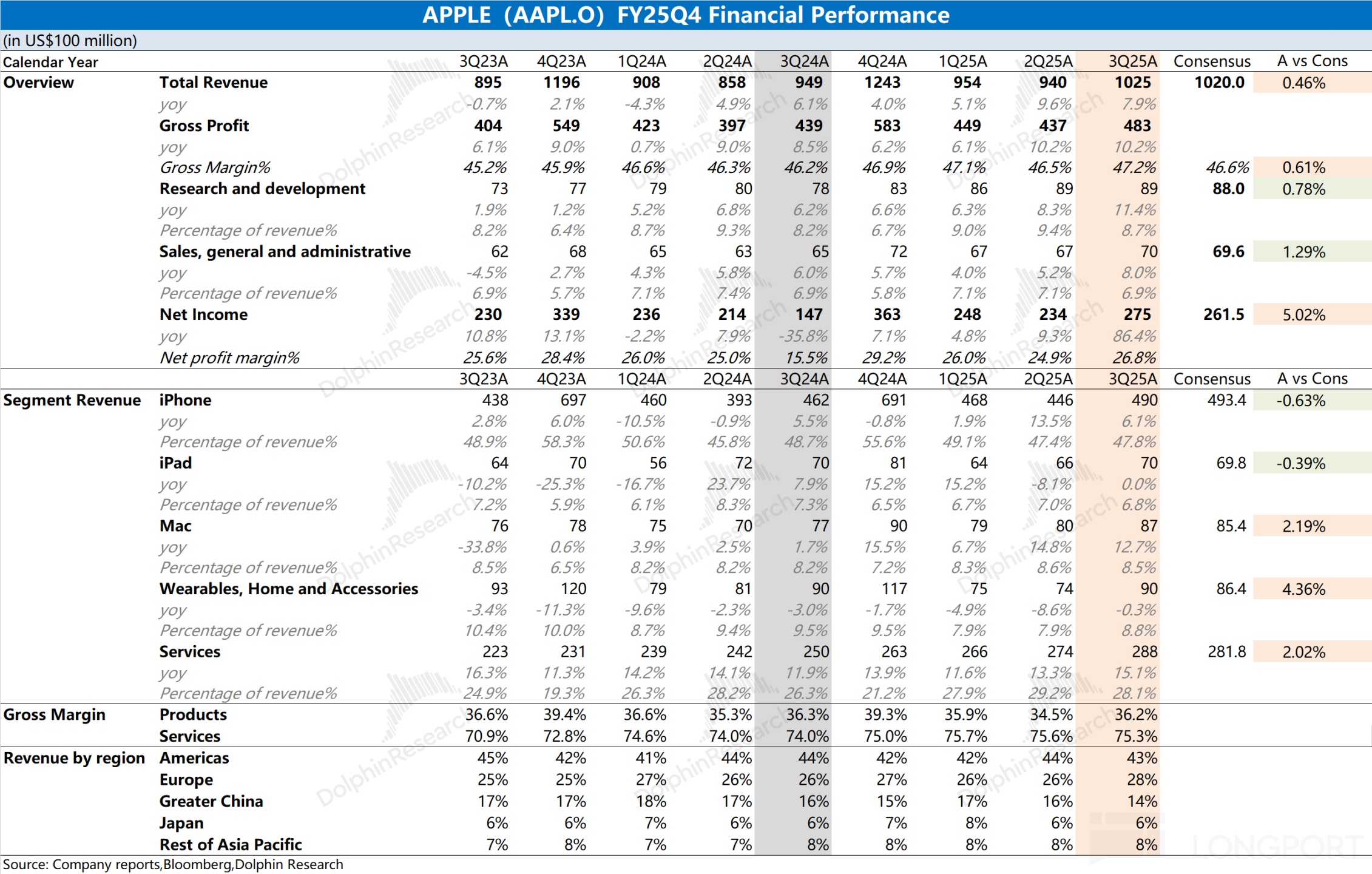 1.1 收入端:2025 财年第四季度(即 3Q25)苹果公司实现营收 1025 亿美元,同比增长 7.9%,符合市场一致预期(1020 亿美元)。公司本季度收入端的提升,主要受益于 iPhone、Mac 和软件服务业务增长的带动,而 iPad 和可穿戴等其他硬件业务表现仍相对较弱。