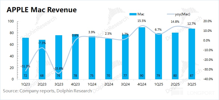 2025 财年第四季度(即 3Q25)Mac 业务收入 87 亿美元,同比增长 12.7%,略好于市场预期(85 亿美元)。