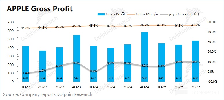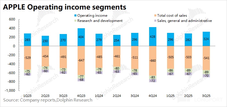 1.3 经营利润:2025 财年第四季度(即 3Q25)苹果公司经营利润 324 亿美元,同比增长 9.6%。苹果公司本季度经营利润的增长,是受收入增长和毛利率提升的共同带动。