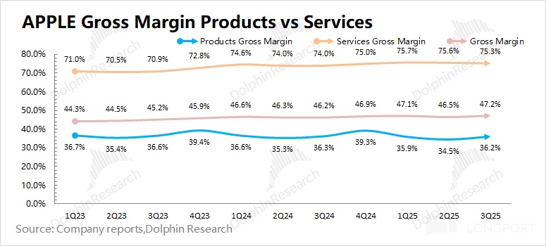 从各地区来看:收入同比都有不同幅度增长。美洲地区、欧洲地区和大中华区是公司最主要的三大收入来源。具体来看,美洲地区的收入占比达到 43.1%,本季度增长 6.1%;欧洲地区本季度增速提升至 15.2%。受 iPhone Air 发布推迟等因素影响,大中华区的收入在本季度同比下滑 3.6%,是唯一下滑的地区,公司预计下季度恢复增长。