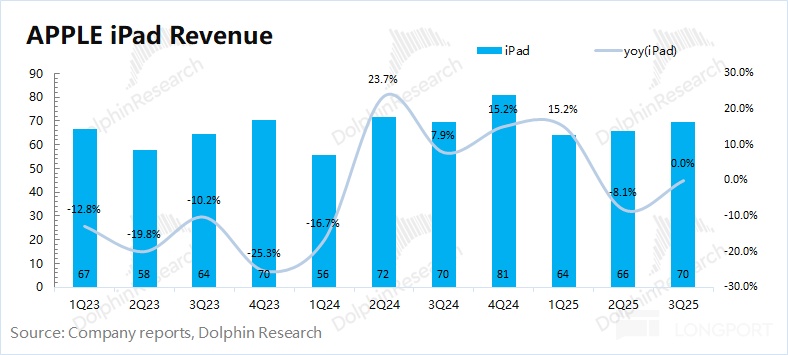 2025 财年第四季度(即 3Q25)iPad 业务收入 70 亿美元,同比持平,市场一致预期(70 亿美元),由于去年 iPad Air/Pro 的发布导致基数较高。