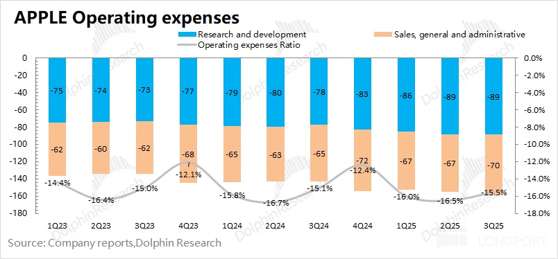 本季度苹果公司的经营费用率为 15.5%,同比下降 0.4pct。公司销售和行政费用保持稳定,这个季度多增的支出也主要体现在研发支出中。
