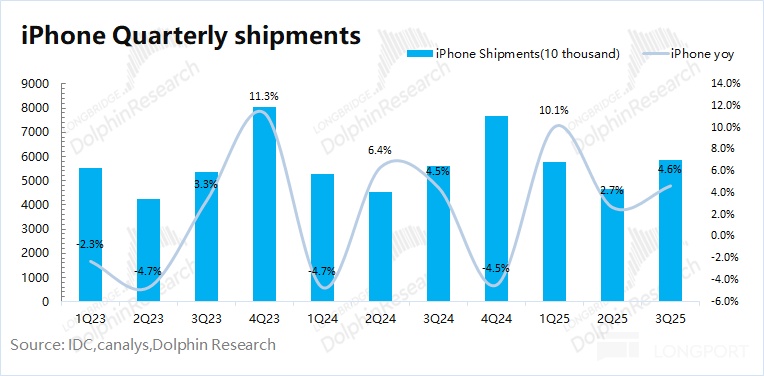 公司本季度出货量增长,主要来自于 iPhone17 系列新品和新兴市场的带动。此外中国地区 iPhone Air 的延迟发布,对本季度出货量也有所影响,实际需求面应该好于 4.6% 的表现。