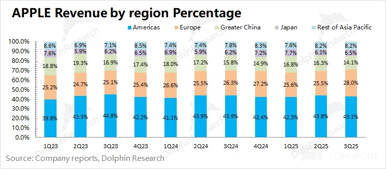 5、分地区收入:其中美洲地区依然是公司基本盘,收入占比维持在 43%,本季度实现 6.1% 的同比增长;大中华区是本季度收入唯一同比下滑的地区,主要是受国补政策以及 iPhone Air 发布推迟的影响。