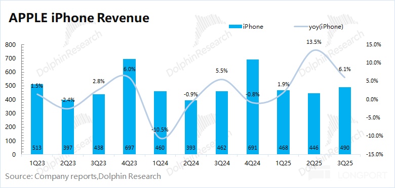 2025 财年第四季度(即 3Q25)iPhone 业务收入 490 亿美元,同比增长 6.1%,略低于市场预期(493 亿美元)。公司 iPhone 业务本季度的增长,主要得益于 iPhone17 系列新品以及新兴市场需求增长的带动。