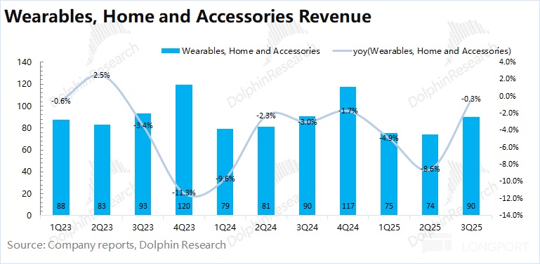 2025 财年第四季度(即 3Q25)可穿戴等其他硬件业务收入 90 亿美元,同比下滑 0.3%,好于市场预期(86.4 亿美元)。可穿戴及其他业务,在本季度基本止住了连续九个季度以来的下滑。