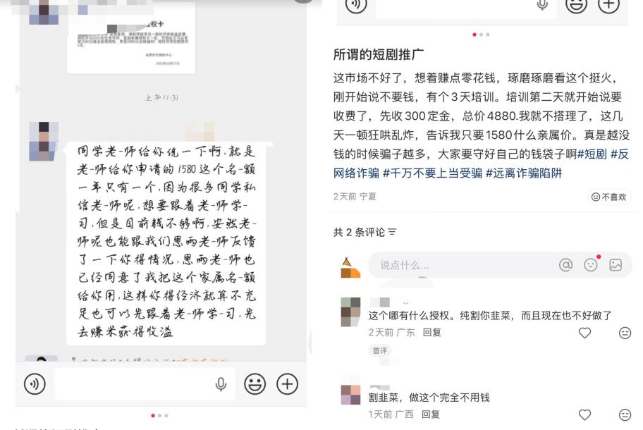 在此类骗局中,从业者们或是宣称自己掌握着独家的推流技巧、内部渠道资源;或是与各大短剧制作方、分发平台有着深度合作关系,能够为推广者提供稳定的素材来源和高效的推广策略,保证短时间内就能实现高额收益;抑或是展示不少成功案例,比如某个新手推广者在短时间内通过他们的指导赚取了数万元,甚至晒出一些转账记录、收益截图,以此来增强可信度……种种手段,可谓精准狙击学员们那颗想走捷径的心。