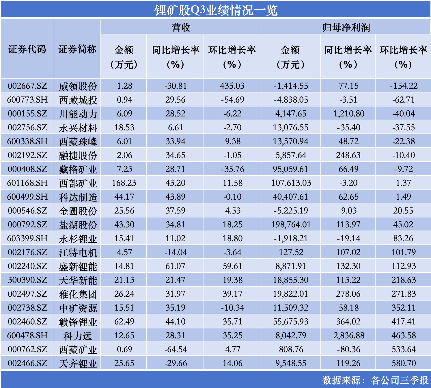 以环比增幅最大的天齐锂业(002466.SZ)举例,前三季度实现营收73.97亿元、归母净利润1.80亿元,同比变动-26.50%、+103.16%。其中,Q3实现营收25.65亿元、归母净利润9548.55万元,同比变动-29.66%、+119.26%,环比变动+14.06%、+580.70%。
