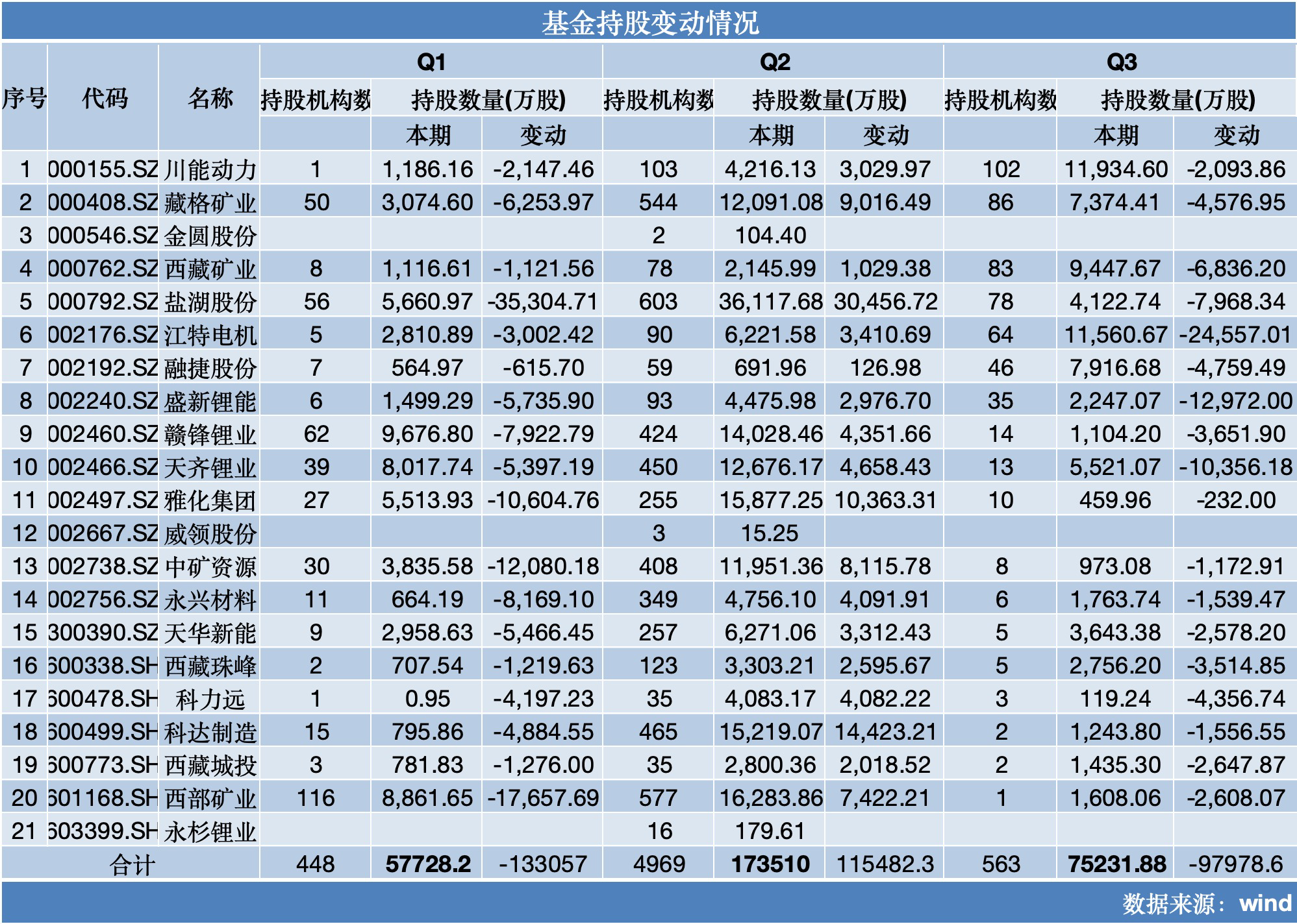 数据显示,今年第二季度,累计有4969只基金持有锂矿股,较Q1末的448只大幅增加;持有数量高达17.35亿股,较Q1末的5.77亿股增逾2倍。到了Q3,随着锂矿板块的集体大涨基金们也纷纷获利了结,到Q3末,持股基金又锐减至563只,持股数量也减至7.52亿股。