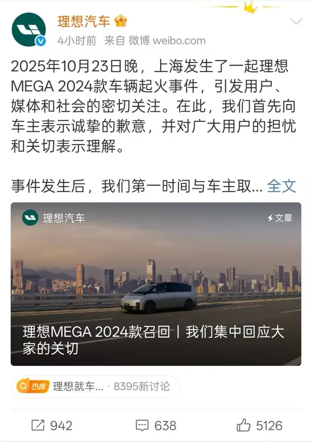 上海理想MEGA起火事故发生后的第8天,车企正式作出回应。