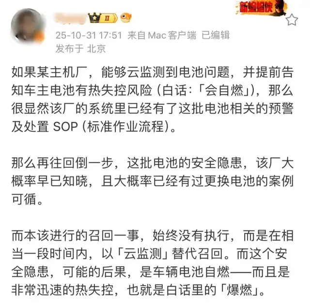 “如果某主机厂,能够云检测到电池问题,并提前告知车主电池有热失控风险,那么很显然该厂的系统里已经有了这批电池相关的预警及处置SOP(标准作业流程)。”