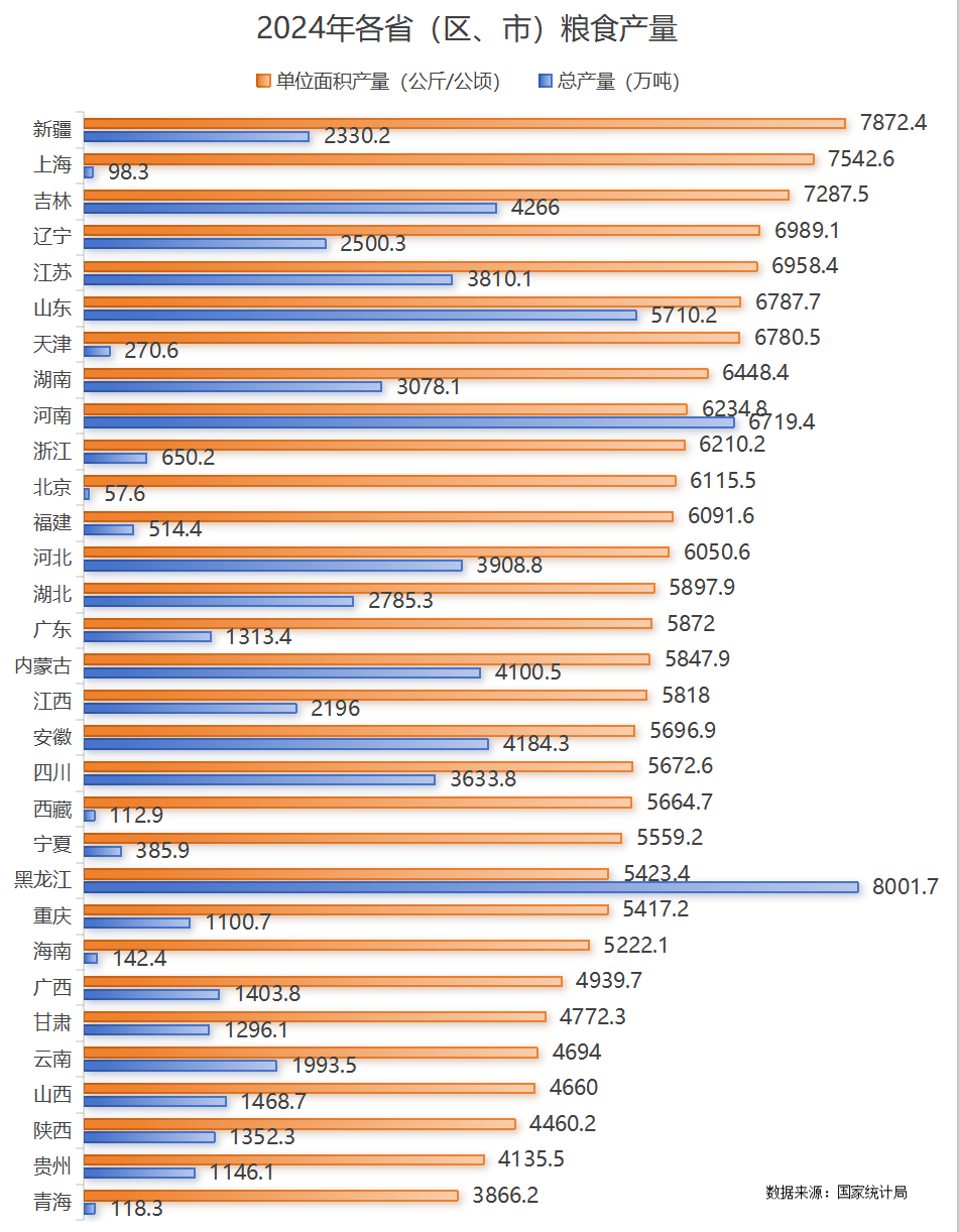 2024年,一个人们想到它基本不会想到粮食的地方,超越了上海,成为新的单产之王——每亩产粮524.8公斤,较全国平均数高出33%。