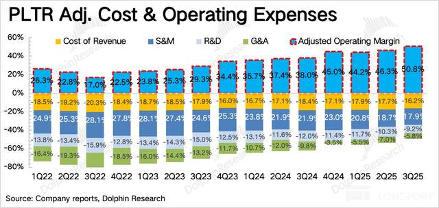 这其实是非常难得的地方,Palantir 的模式决定了,业务扩张需要人员团队同步扩张,但实际不涨反缩。甚至从指引来看,Q4 经营利润率隐含还将继续环比提升 2%,由此可见 Palantir 极致的经营效率。