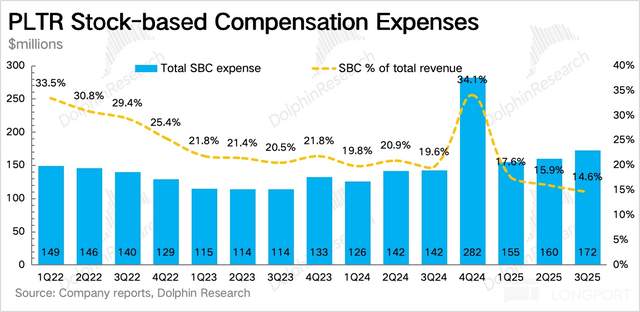 三季度 Palantir 实现 GAAP 下经营利润 3.93 亿,三项经营费用继续维持在 20% 左右的同比增长,低于收入增速,因此利润率提升。SBC 增幅不高,但相比收入占比继续下滑。考虑到同期市值上涨了 30%,因此可能在同步进行员工优化。