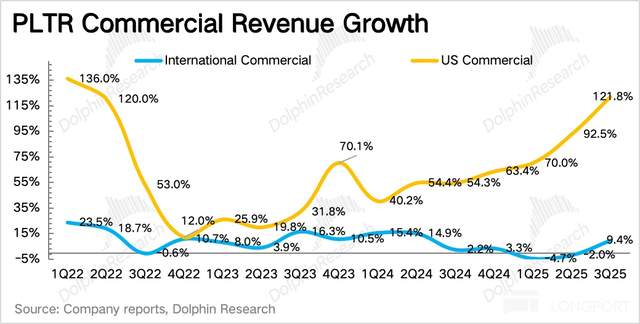 1. 美企需求还没到头:政府收入被视作 Palantir 的护城河,但高估值对应的高增长预期,则靠的是美国商业收入。三季度整体商业收入继续加速增长,而美国本地企业的需求,再次将增速拉高到 122%,还未看到见顶风险。