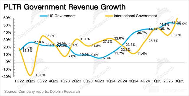 三季度政府客户收入同比增长 55%,增长主力依然是本地政府,但国际政府本季度明显加速,增速甚至超过了美国,体现今年以来的签单(北约、英国、德国等)逐步开始进入服务周期。