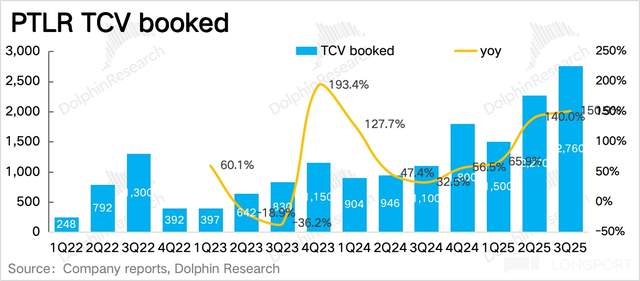 (1)中长期视角关注 TCV、RPO、客户数量:三季度 TCV(总合同价值)同比增长 150% 达到 27.6 亿美金,其中美国商业订单三季度增长 252%,是增长贡献主力。