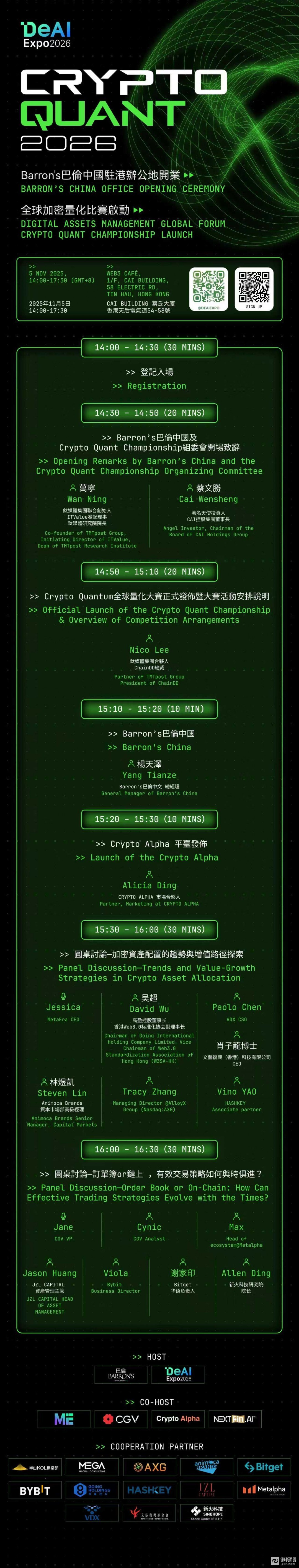 11 月 5 日下午,由 Barron's 巴伦中文、DeAI Expo 2026 共同主办的全球加密量化大赛 Crypto Quant Championship 2026 发布仪式,以及 Barron's 巴伦中文香港办公室开业活动在位于香港天后电气道的蔡氏大厦举办。