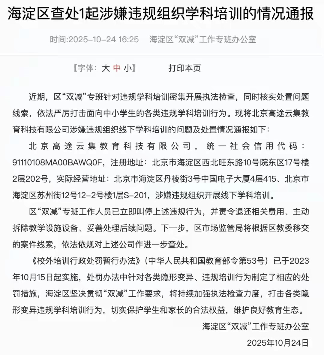 近日,海淀教育官网发布消息,海淀区“双减” 专班查处北京高途云集教育科技有限公司涉嫌违规组织线下学科培训,并通报了相关情况。