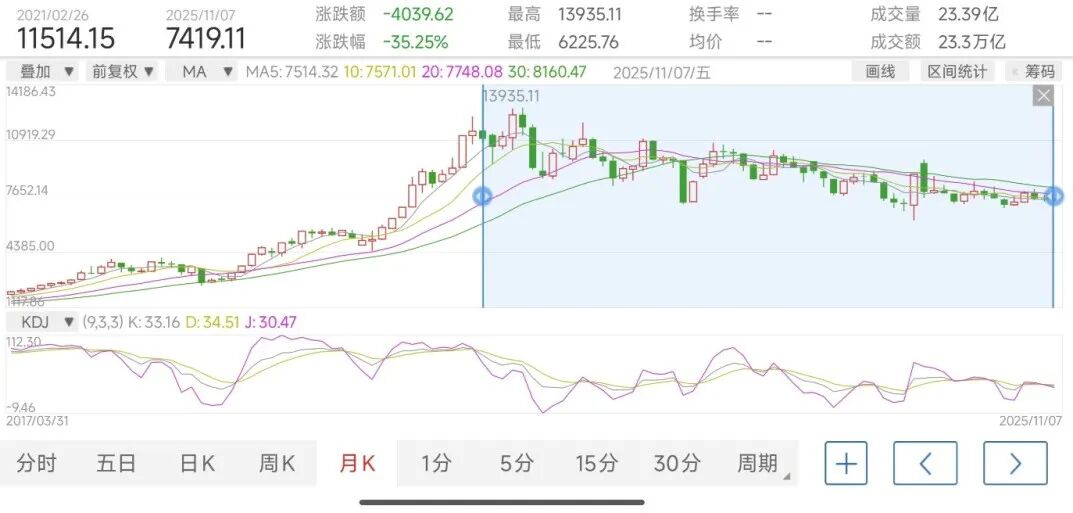 具体来看,曾经号称“A股核心科技”的白酒,在这轮行情中堪称 “拖后腿”。1月2日,白酒板块的指数为7479,历经多轮波动后,11月6日反而跌至7432,较年初微跌47点;若对比2021年14000点的高点,当前仍处于 “腰斩” 状态。高位追入且未割肉的基民,即便在4000点的大背景下,也只是 “参与了个寂寞”。