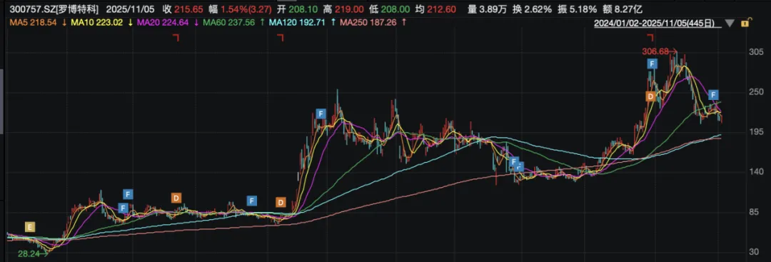 此后,公司股价再度短期回调,而拟赴港上市消息公布后,于9月18日涨到306.68元/股。随后又迅速回调,截至11月5日收盘,罗博特科报215.65元/股,一个半月时间跌去了29.68%。