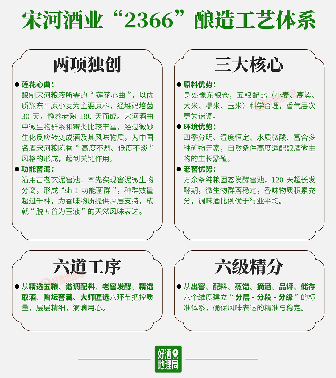 宋河人在不断摸索中,逐渐形成了独特的“2366”酿造工艺体系。该工艺涵盖从一粒粮到一滴酒的生态演变过程,涉及原料选择、酒曲制作、窖泥培养、原酒酿造、储存陈酿、酒体设计等白酒生产全流程。