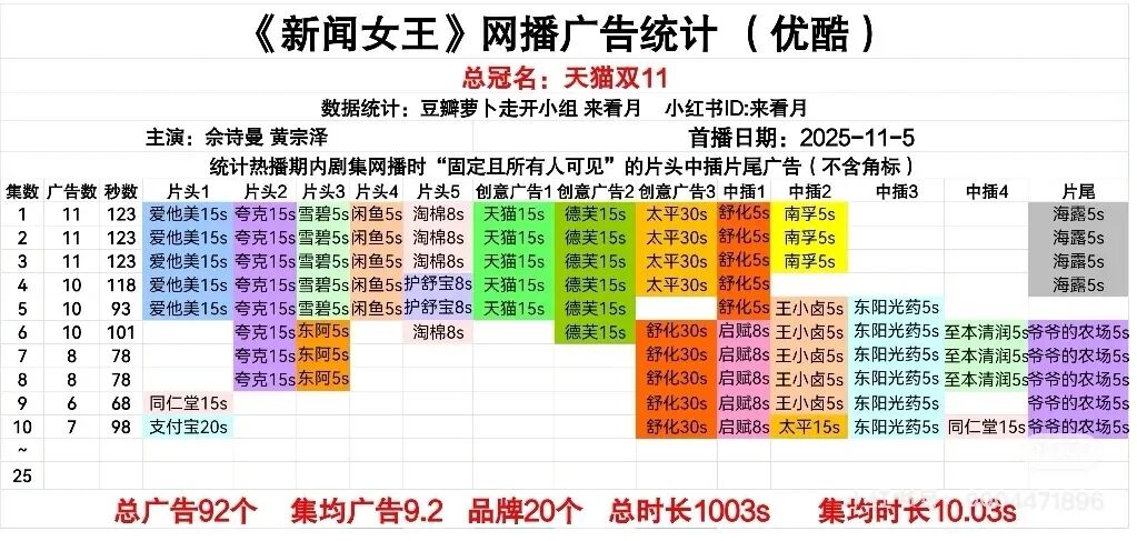 具体来说,其前10集总广告量达92条,总时长约17分钟;其中,开播当日单集广告量达11条,总时长123秒,一举刷新了优酷平台2025年度剧集的单集广告密度纪录。从商业维度来看,《新闻女王2》的开局表现,证明了其作为港剧头部IP的商业号召力。