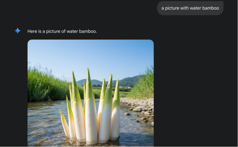 上文提到的神秘茭笋和神奇H₂O分子,由于过于幽默,舆论扩散后已经被连夜撤下。但我还是不死心,茭笋这么神奇的新物种是怎么制造出来的?在我打算用Gemini复现一下这张AI图时,突然想起来,茭白是中国的本土物种,国外不常见,而茭白的英文翻译是:water bamboo。于是我让G老师帮我生成一张water bamboo的图片, 一下子,我顿悟了,甚至感觉自己找到了山姆最爱的那条河。