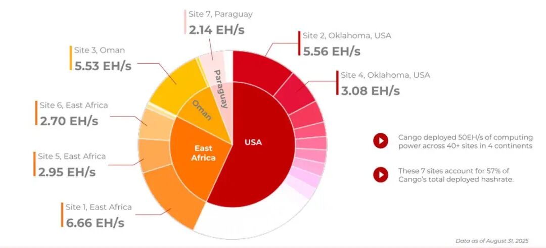 截至2025年8月底,公司在全球运营40+站点,总装机容量1.2GW,平均在线率90%。算力分布主要在四个核心区域:美国(约28EH/s)、中东阿曼、东非和巴拉圭。