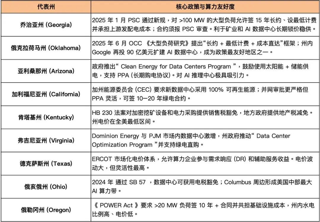 整体趋势看,主要电力州都在向“长约制、绿电化、低税负”方向演进,算是为矿业与AI/HPC数据中心双用途模式提供政策窗口。