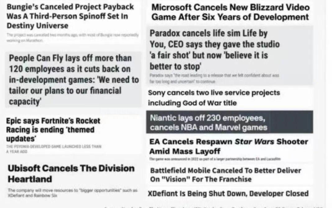 随手翻翻近期新闻,Supercell砍掉了曾经势头很猛的《爆裂小队》;微软Xbox又双叒裁员数百人,动视暴雪、光环工作室等都受影响;亚马逊砍掉了《新世界》和《指环王》网游,尔湾、圣迭戈的团队皆受波及......