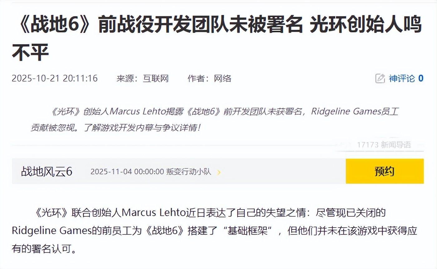 Ridgeline的工作被废弃,没有出现在战地6开发者名单上