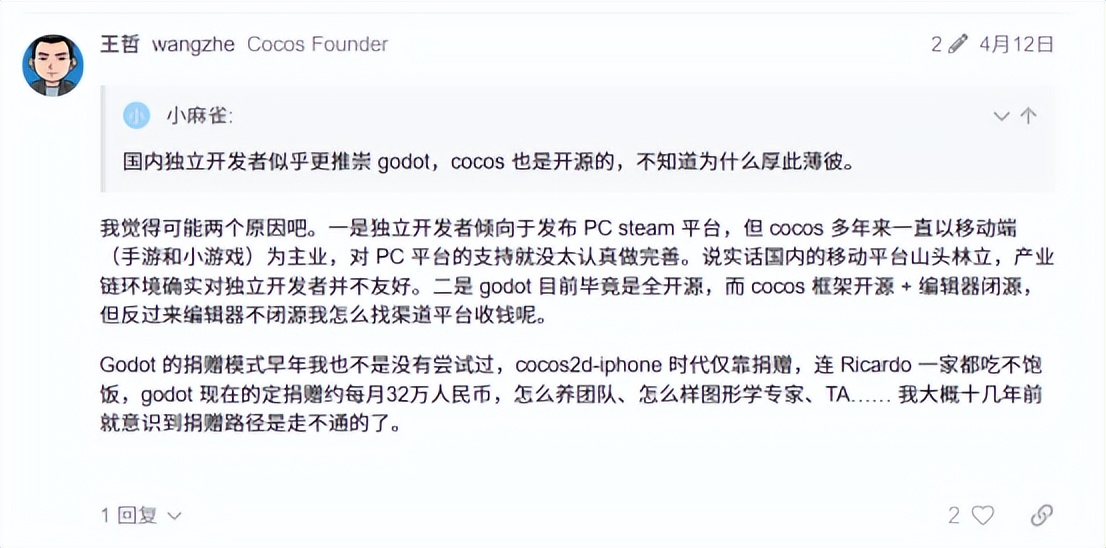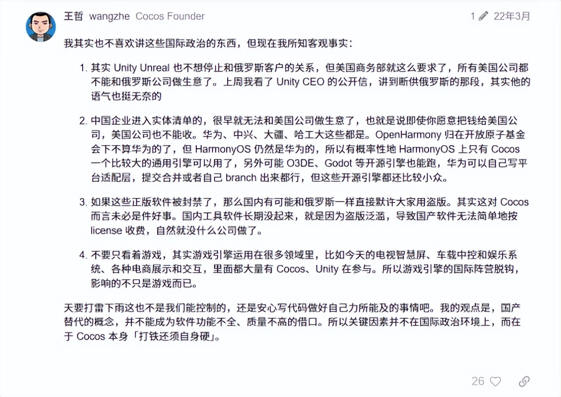 2022年3月的时候cocos论坛有个这样的帖子,聊中美竞争的背景下,未来技术封锁Cocos可能成为唯一可以用的国产引擎。