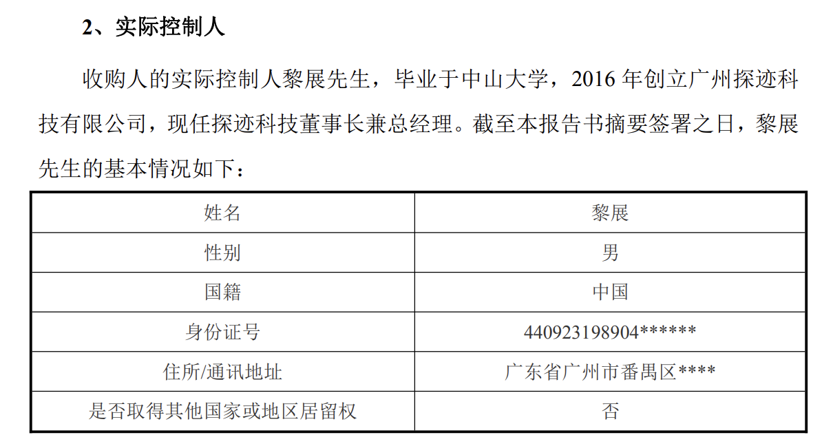 公告显示,公司控股股东、实控人日前与广州探迹远擎科技合伙企业(有限合伙)(下称“探迹远擎”)签署《股份转让协议》,后者将成为新任控股股东,公司实控人将变更为AI销售领域独角兽企业“探迹科技”的实控人黎展。交易完成后,探迹远擎将启动部分要约收购。