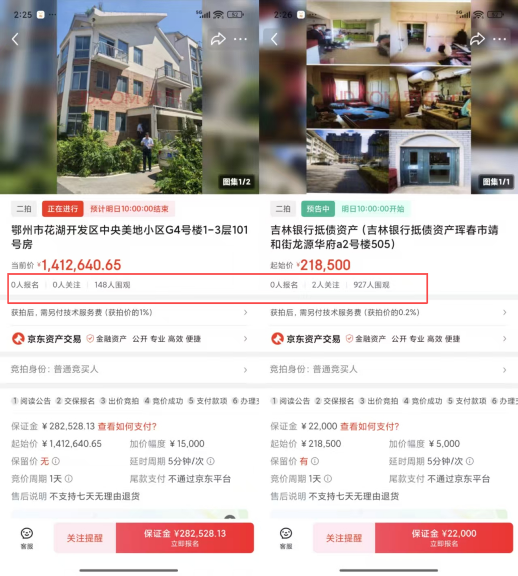 比如,前文提到的珲春市靖和街龙源华府和鄂州市花湖开发区中央美地小区的房产,前者预告11月13日二拍,目前尚无一人报名;后者于11月12日开始二拍,无人报名、无人关注,围观人数只有区区147人。