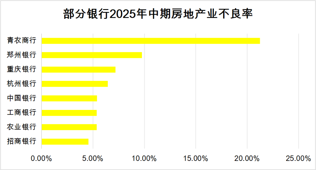 其他如郑州银行、重庆银行、杭州银行、农业银行、招商银行、中国银行、工商银行,房地产业的不良率也都不低,分别为9.75%、7.19%、6.44%、5.35%、4.56%、5.38%、5.37%。