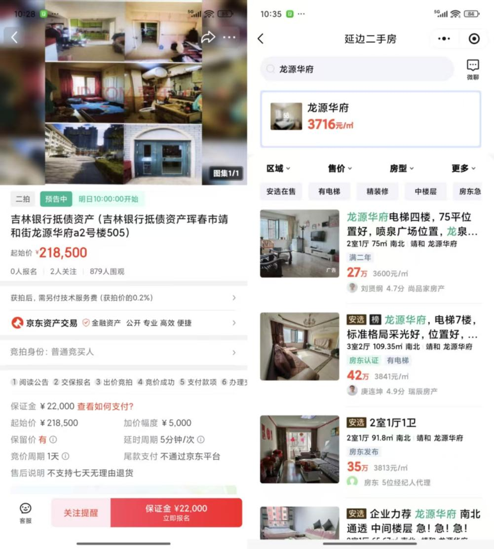 以吉林银行持有的珲春市靖和街龙源华府的房子为例,建筑面积81.51㎡,起始价21.85万元,每平米仅卖2680元/㎡,对比安居客上同小区的挂牌均价3716元/㎡,相当于打了7折。