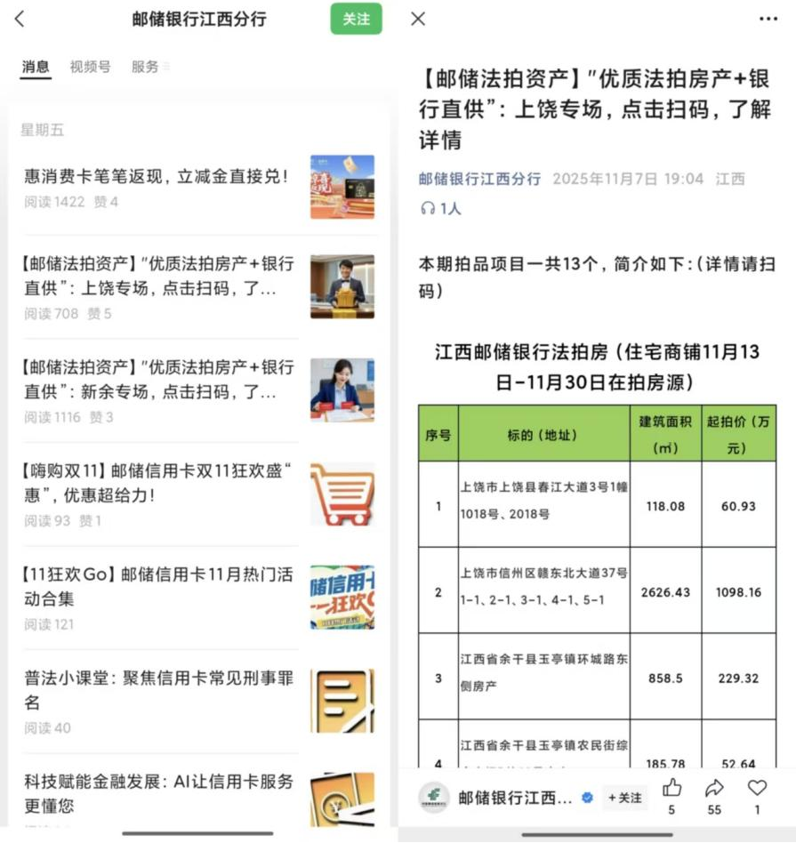 例如,邮储银行江西省分行在其官方微信公众号,连续发布了多期以“法拍房产·银行直供”为主题的资产推介信息,涉及上饶市、新余市、南昌市、抚州市、等多个地区,彰显出加速处置不良、积极回收债权的态度。