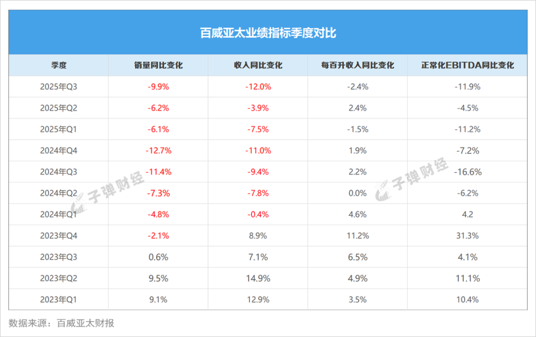 从单季度收入来看,百威亚太则已经连续7个季度出现同比下滑的情况。
