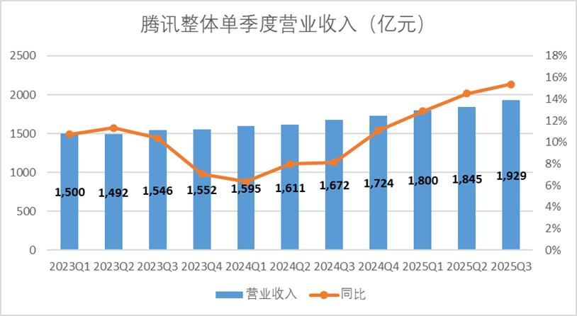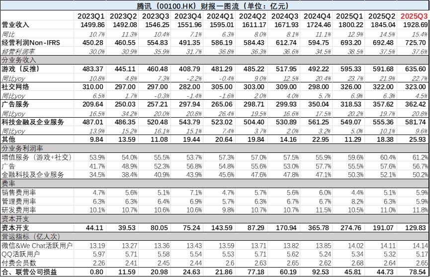 财报显示,腾讯本季录得营收1928.7亿元,超出市场预期逾42亿,同比增速达15.4%;经营利润725.7亿元,经营利润率稳居37.6%的高位。