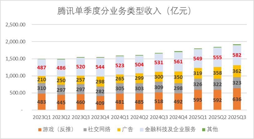 营销服务是腾讯第三大业务,主要就是广告收入;金融科技及企业服务包含较多,主要营收贡献分为两部分:支付、财付通等互联网金融产品,以及腾讯云业务。