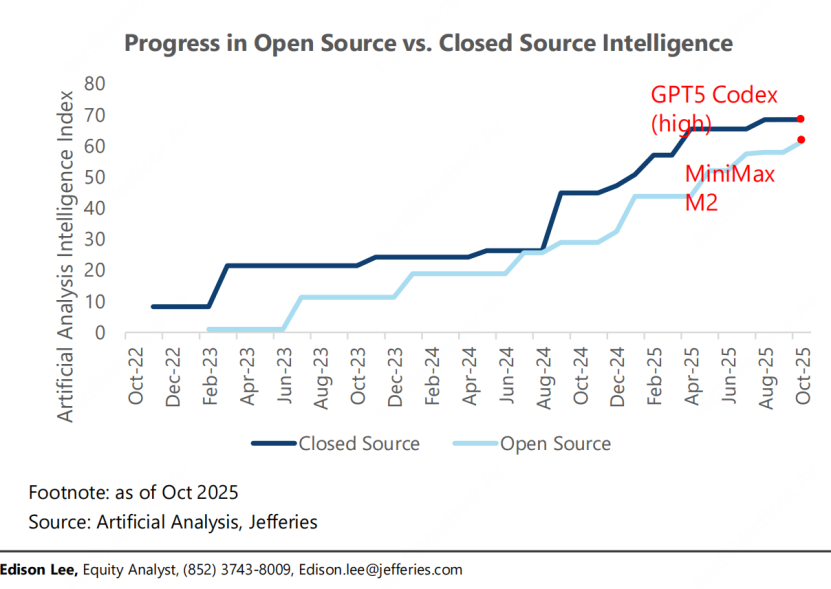 就在11月,杰富瑞(Jefferies)在报告《全球语境下的中国人工智能》(China AI in a Global Context)中指出:2023 至 2025 年间,中国主要云厂商的资本开支总额为 1240 亿美元,比美国同行少了 82%,但中国最先进的大模型如 MiniMax M2 的性能,仅比美国最强的 模型如GPT-5 落后约 10%。