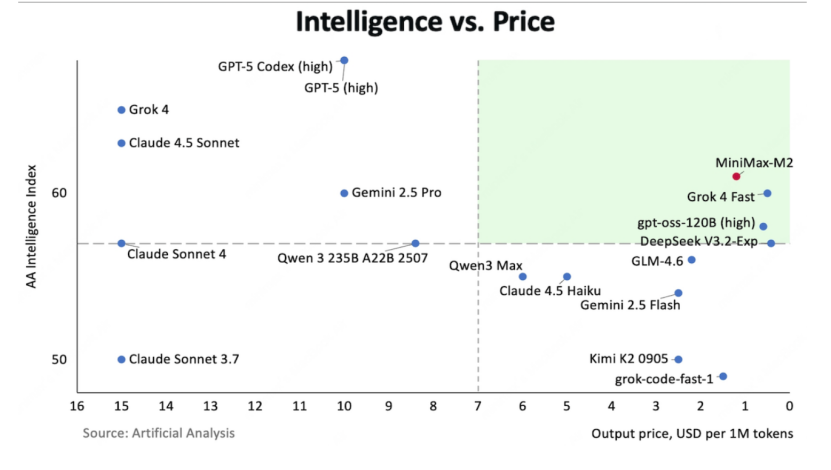 在性能层面,GPT-5的两个版本虽领先市场,但其token成本却远远落后;而在成本与性能综合领先的第一象限,MiniMax的M2与Grok 4 Fast难分伯仲。