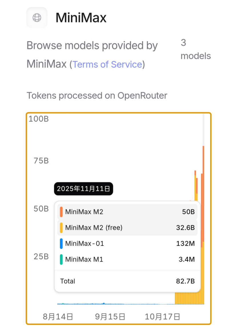 开源后,MiniMax M2(含免费与付费版本)在第三方平台 OpenRouter 上的调用量已突破 800 亿,位居开源模型前列。