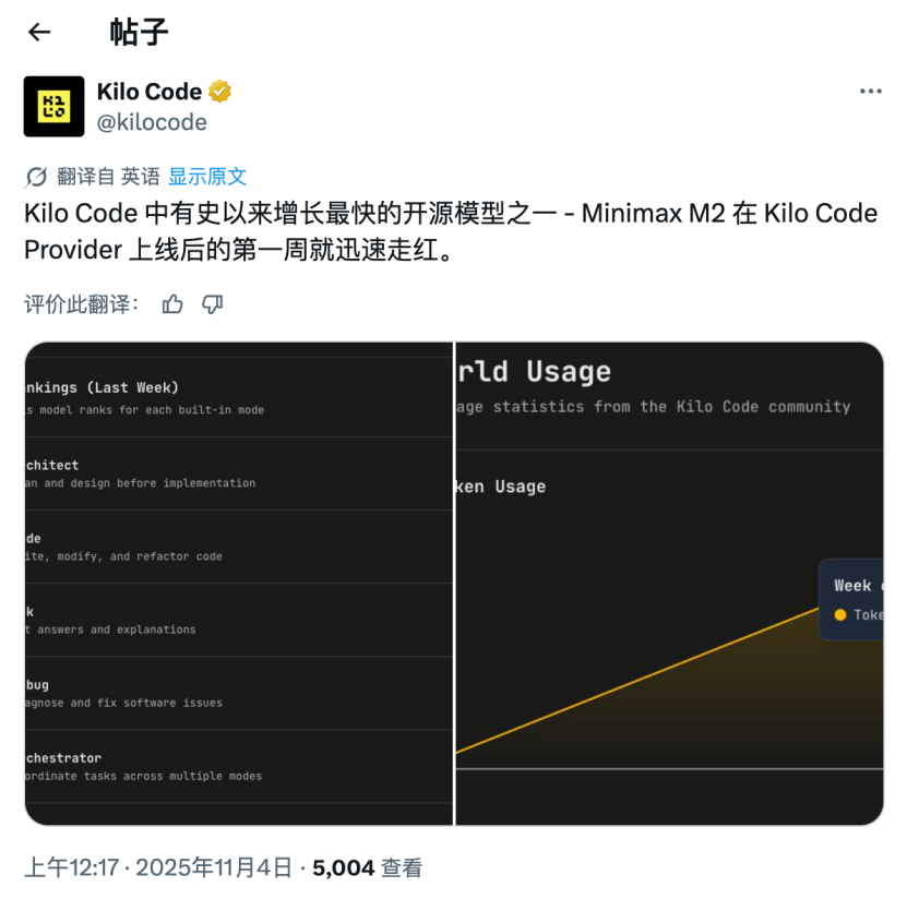 作为汇集全球第三方 AI 应用流量的平台,OpenRouter 的数据更接近市场的真实反馈——M2 能在短时间内快速赢得部分原属硅谷模型的用户与算力时间,显示出中国模型在开放生态中的势能。
