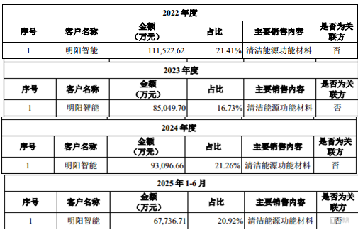更值得关注的是业绩真实性问题,明阳智能作为振石股份报告期内的第一大客户,双方披露的交易数据存在较大差距。招股说明书显示,报告期内,振石股份向明阳智能产生的销售收入分别为111522.62万元、85049.7万元、93096.66万元、67736.71万元,明阳智能在始终位列在公司的第一大客户头衔。
