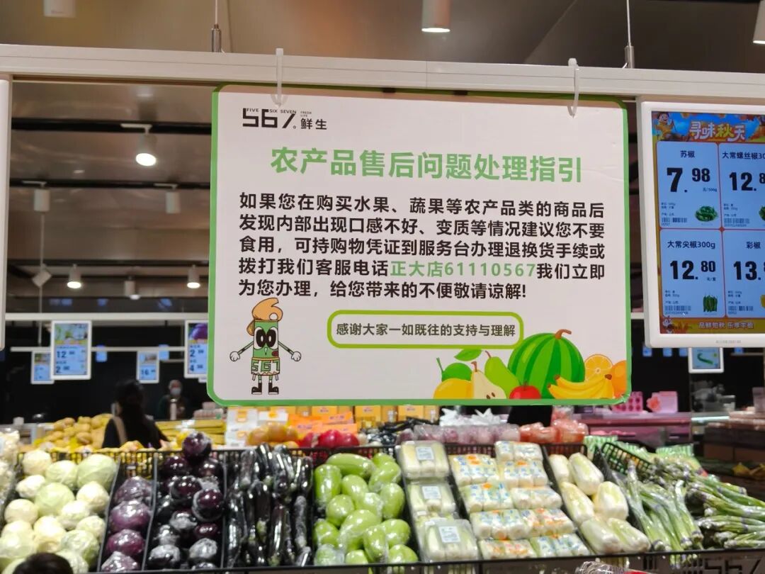 除了烟火气之外,新鲜度也是评判商超品质的重要标准,567鲜生也在夯实商品新鲜度上多有发力:生鲜区引入多款包装净菜,货架上方明确张贴“农产品售后问题处理指引”,消费者若购买的果蔬生鲜出现口感不佳、变质等情况,可直接到服务台办理退货。