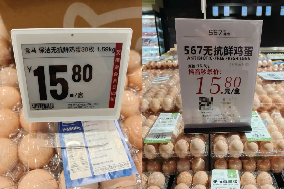 不只是烘焙品类,567部分自营商品的质价比也有待提升,比如567自营的3kg除螨除菌洗衣液售价26.9元(抖音特价25元),对比盒马自营的3kg香氛抑菌洗衣液售价23.9元;还有567的无抗鲜鸡蛋30枚1.6kg原价16.8元(抖音限时价15.8元),对比盒马自营的保洁无抗鲜鸡蛋30枚1.59kg售价15.8元。