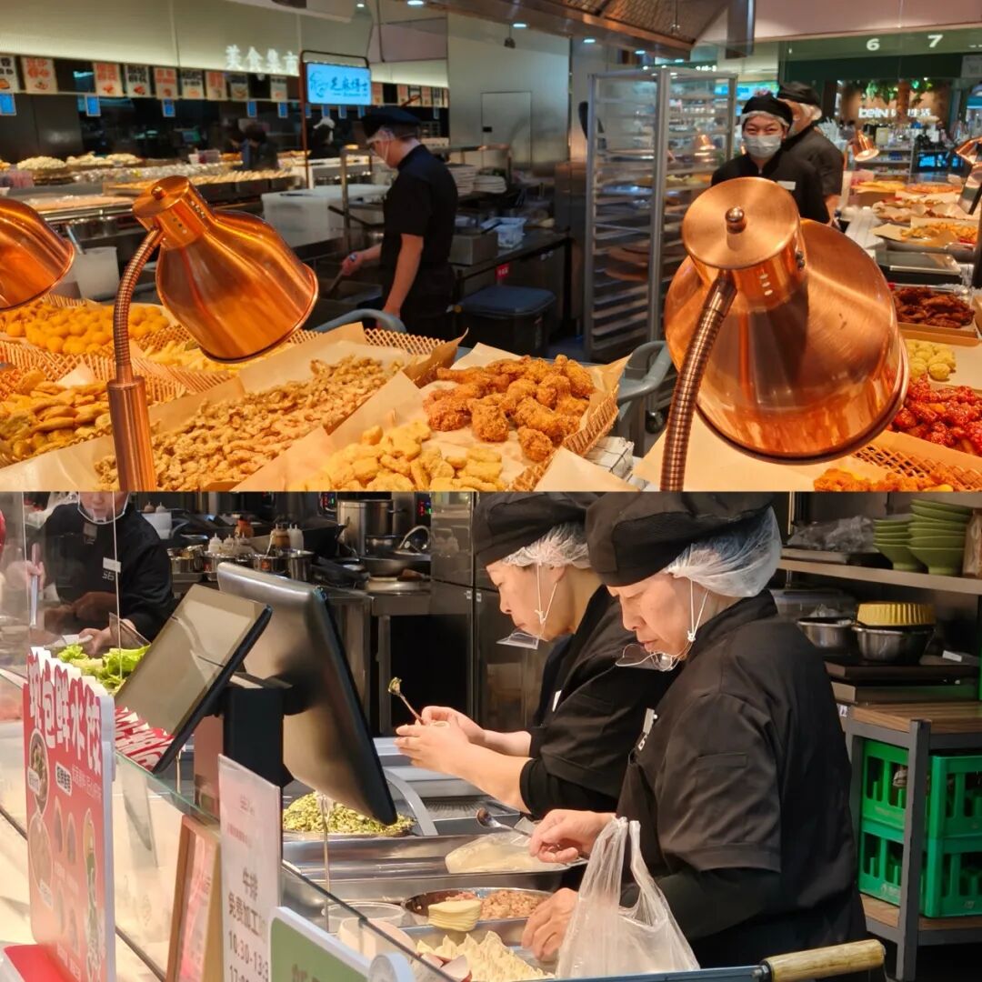 熟食区后方还规划了专属就餐区,免费提供米饭与汤品,同时推出杂粮煎饼、自选麻辣烫、现炒小菜、泰餐冬阴功汤等多款菜品,均为顾客点单后由工作人员在陈列岛内的操作间现做现供。