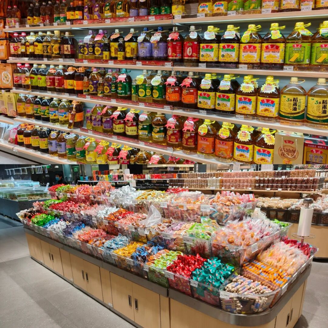 从传统社区小超市升级为入驻购物中心的综合新商超,567鲜生的转型过程中仍保留了部分传统大卖场的特质,比如酒水饮料区、粮油米面区仍陈列着大量大流通品牌商品,可口可乐、百事可乐等饮品,以及鲁花、金龙鱼、福临门等粮油品牌均在列。